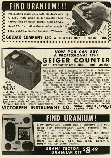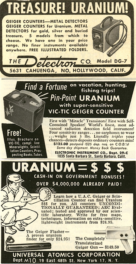 After the Soviet Union tested a nuclear weapon in 1949, the United States government went on a uranium-buying spree, which created the first wave of atomic opportunity. In 1951 the Atomic Energy Commission became the sole legal buyer of uranium ore in the United Sates and offered double the usual rate for miners who discovered uranium deposits. Most uranium is in Utah, Colorado, Arizona, and New Mexico in prehistoric streambeds, where fossilized trees become radioactive over the centuries. Thousands of individual miners set off in search of uranium using hand-held Geiger counters, such as those advertised here.