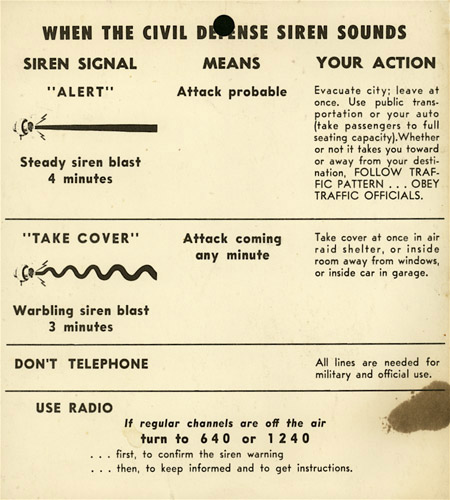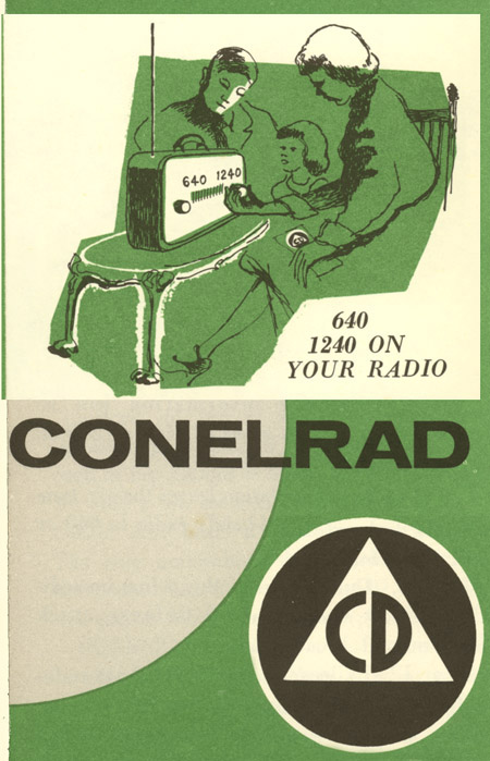 Conelrad, short for CONtrol of ELectromagnetic RADiation, was set up as a nationwide radio alert system and everyone was taught to turn their radio dial to either 640 or 1240 AM for nuclear attack news. Additionally, a standard system of warning signals was worked out, as shown below.