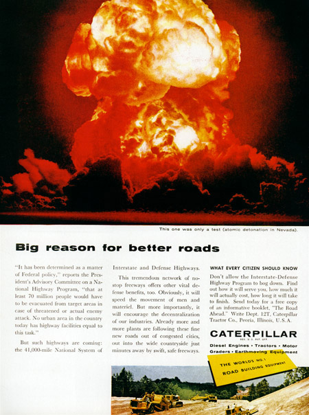 The second ad, from Caterpillar, is from 1958 and states that in the event of a nuclear attack, as many as 70 million people may have to be evacuated from major cities. This would, as you may expect, put a tiny bit of stress on the national highways and roads. So Caterpillar suggests building better highways as part of our national defense efforts.