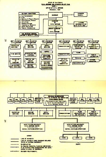 The booklet goes on to give this great advice, which includes wearing long-sleeve shirts to minimize burns. And if you think the response to hurricane Katrina was muddled, imagine the response to a nuclear attack from the people listed in the “Civil Defense and Disaster Relief” org chart below. Very reassuring to teachers, I’m sure.