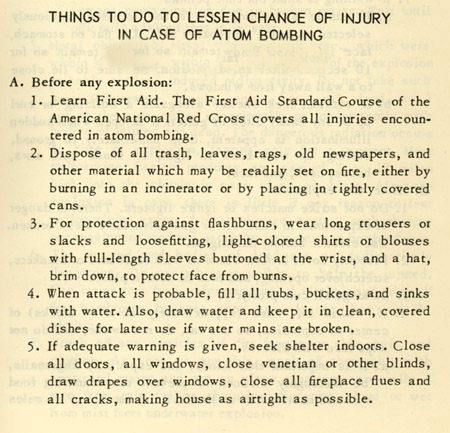 So the United States began to prepare the citizenry to the possibility of a nuclear attack. A nation-wide system of bomb shelters was set up, and all major cities installed air-raid sirens that would alert the citizenry of a coming nuclear attack. In my town these sirens were tested once a month. We would practice drills at school, always aware that before exiting the building we should line up in height order, presumably so it would be easier to identify our charred bodies later. This 1951 booklet was distributed to teachers in the Los Angeles School district to educate them on the threat of nuclear attack.