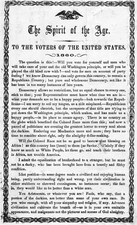 This week, I’ll look at voting images from the past and re-cap a few highlights from our slow progress toward a more perfect union. Many of these images come from the Library of Congress and a few from the Smithsonian, both of which have great collections of things related to democracy. Looking back in American history is sometimes uncomfortable as we see a side of our ancestry that is racist, sexist and worse. But I believe recognition of these past injustices is necessary to move on. And in light of some of the ugliness that has reared its head in this current election cycle, it seems even more fitting to remind ourselves that hatred or fear of those not exactly like us is a tendency we must guard against with vigilance and unity. What in retrospect seems so offensive was, at the time, a source of misguided pride among people who surely considered themselves “real” Americans.