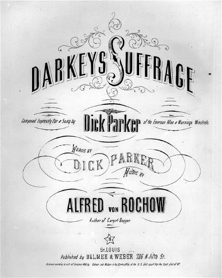 Here, from 1860, is an anti-black-voter advertisement from a New York paper, followed by the pro-voting rights sheet music for “Darkeys Suffrage” in 1868, and a wood engraving from 1866 highlighting the “radical” platform in favor of granting rights to black citizens.