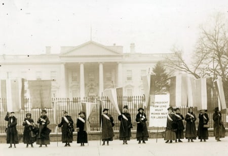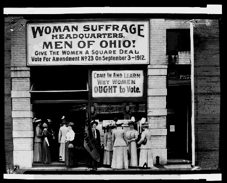 Women organized a strong suffrage movement and many went to jail, were beaten, and were otherwise demeaned for protesting. Here is a 1917 image of 14 suffragists on the picket line in front of the White House, followed by a 1918 picture of police confronting women during a demonstration in front of the Senate office building, and a 1912 image of the Woman Suffrage Headquarters in Cleveland, Ohio.