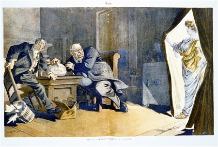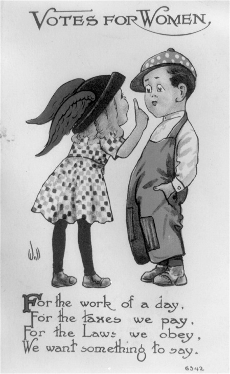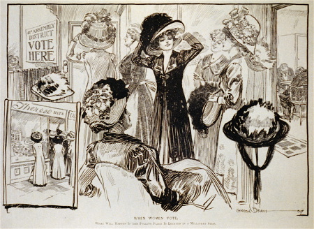 Again, it was fear that stalled the process. Here is a mocking cartoon from 1909 that suggests what might happen if women voted anywhere near a hat store, followed by another cartoon with a caption saying that women spend all their time on clothes and gossip simply because they don’t have anything to talk about. Give her the right to vote and “she will cease to be vain and frivolous.” Below that is a 1914 illustration entitled “two’s company, three’s a crowd.”
