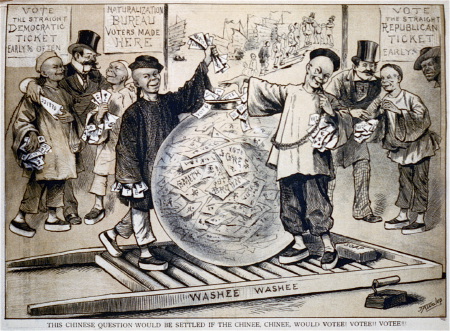 It seems that almost every group besides white men was targeted at one time or another as being somehow anti-American and unworthy of the right to vote. Here, from 1879 is a cartoon suggesting that if Chinese immigrants were given the right to vote, they would go with a straight Democratic ticket.