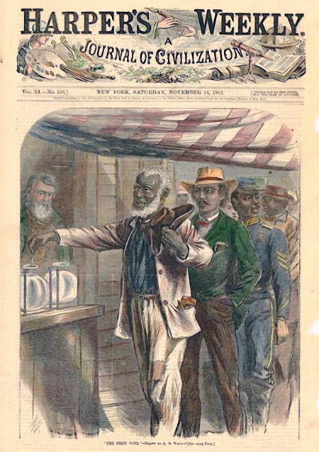 Fortunately, reason won out, the Fifteenth Amendment was passed, and black citizens got the right to vote. Here is a Harpers Weekly cover showing the “first” black man casting a vote, followed by a print highlighting the struggle and signing of the Amendment.