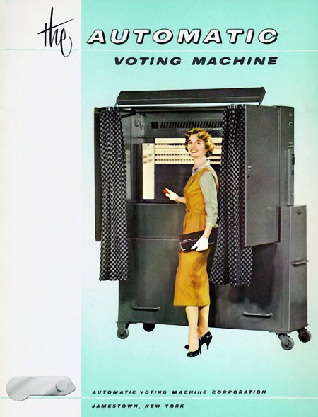 So despite voting technology progress, we still squabble not only about who is qualified to vote, but if the voting is accurate and untainted by corruption. Here are several images of more modern voting machines, the first from a voting machine brochure in 1948, then of the pull-handle variety popular up until the early 1960s, and finally of the Votomatic vote recorder from 1964. (All from the Smithsonian Institution collection.)