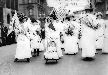Despite a few rogue state laws that let women vote early on, by 1807 it was illegal for women to vote in all the states. And of course pretty much any man not of white European heritage was denied citizenship, and with it the right to vote. The first of those groups to gain voting rights (at least in the Constitution, if not in practice) were black men. In 1867 the Fourteenth Amendment extended citizenship (but not voting rights) to black Americans, and explicitly excluded women from full citizenship. In 1870, the Fifteenth Amendment extended voting rights to black citizens, but again, women were excluded.