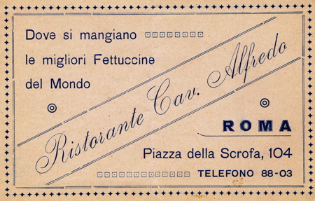It’s interesting to note that even though these tended to be more ornate times from a design standpoint, some of the more elegant cards are simple and straightforward, even by today’s standards. The card below is from Alfredo’s Restaurant in Rome, home of the original Fettuccine Alfredo.