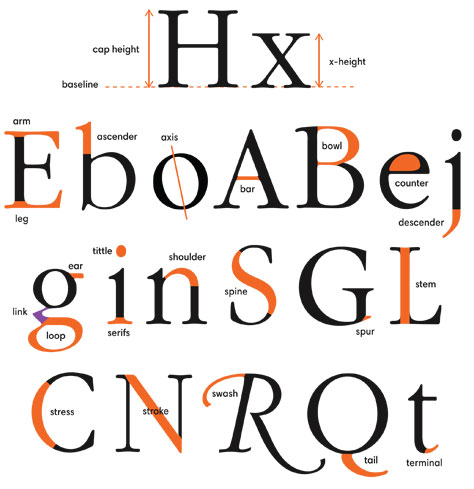 A. Knowing the terminology for the anatomy of a character might seem like a painful exercise in memorization, but it’s actually useful knowledge for any design professional. Not only does it make it easier to communicate about typefaces and their characteristics, but it also serves to educate your eye to recognize the underlying structure of typeface designs, as well as the differences between them.