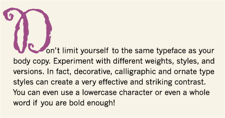 • Don’t limit yourself to the same typeface as your body copy. Experiment with different weights, styles, and versions. In fact, decorative, calligraphic and ornate type styles can create a very effective and striking contrast. You can even use a lowercase character or even a whole word if you are bold enough!