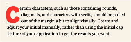 • The key to using initial letters successfully is proper alignment. If the character is intended to appear flush left with the text, it should align optically rather than mechanically. Certain characters, such as those with rounds (C, O, S, etc.), diagonals (A, V, W, Y) and characters with serifs (which get proportionally larger with size), should be pulled out of the margin a bit to align visually. Create and adjust your initial manually, rather than using the initial cap feature of your software to get the results you want.