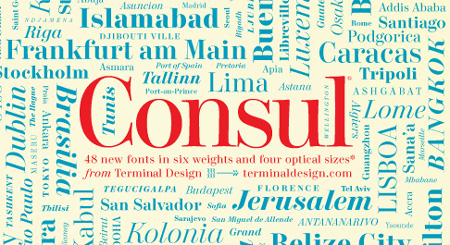 Consul by Terminal Design is an optically sized family available as Caption, Text, Deck (subhead), and Display. James Montalbano has “democratized” this high-contrast design, making it surprisingly legible at smaller sizes.
