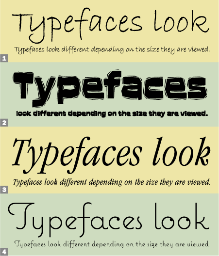 Sometimes they’re interchangeable, but not always. Typefaces look different depending on the size at which you view them. Spacing, proportions, and design details change optically. A text face used at large sizes can sometimes look clunky, heavy, and unattractive, and the spacing looks too open. On the other hand, display designs used at small sizes can have design features that break up, disappear, or fill in when viewed small; become less readable; and look too tight.