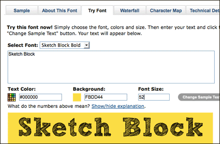 Once you choose a font on Fonts.com, click the Try Font tab and enter your desired text, as well as the font weight and the color of the text and background. Then click on the Change Sample Text button.