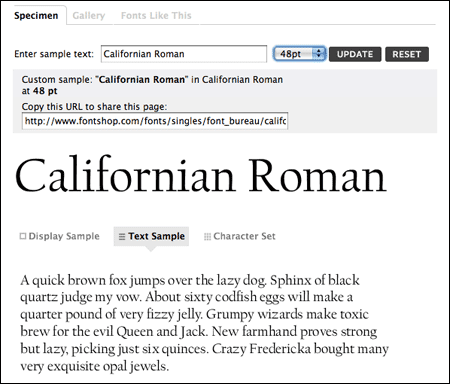 Most font foundries and distributors have some sort of font preview feature. See the examples below, and also check out Terminal Design’s cutting-edge Font Tester, P22’s Typecaster, and House Industries’ Try Fonts. Have other favorites? Let me know in the Comments!