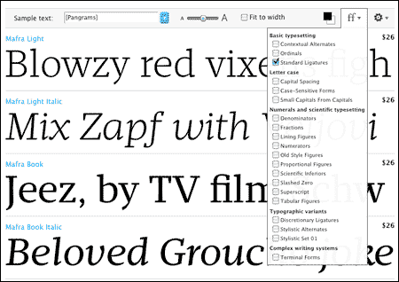 Caveat: Since font previews are intended for onscreen viewing, the resolution is low. While that’s OK for large display type, it’s less helpful for small text. The details of small text can be hard to see at a computer monitor’s low resolution.