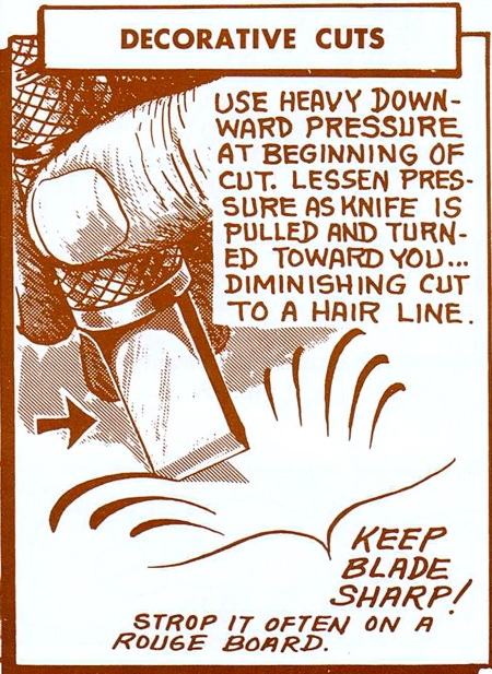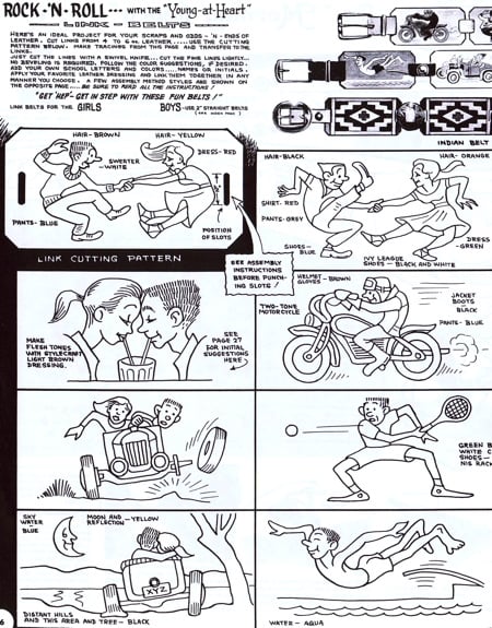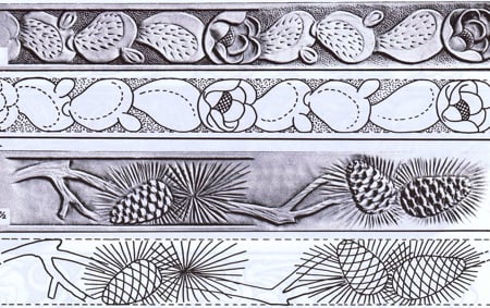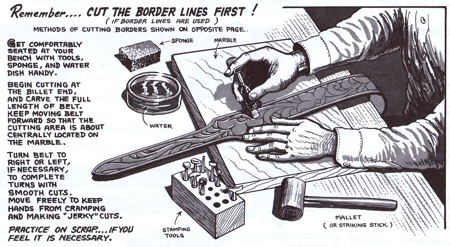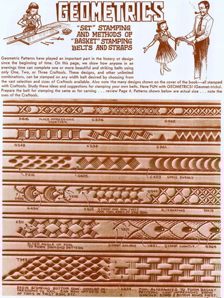 It was there I discovered a series of books by the master leather-crafter and prolific author, Al Stohlman. These are a treasure of leather art, illustration and lettering. Everything on the complex pages of these over-sized booklets came from Stohlman’s hand, including all the text, borders and graphic elements. Click on any image for a larger version (which you’ll need to appreciate these).