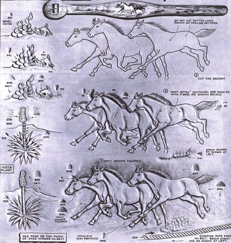 Stohlman, on the other hand, was a master. You have to appreciate the intricate nature of such work, mostly done with a mallet and a stamping tool. His largest color piece, which is at the museum, measures 43″ x 27″. He and his wife Ann made custom saddles at their ranch in Canada.