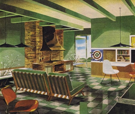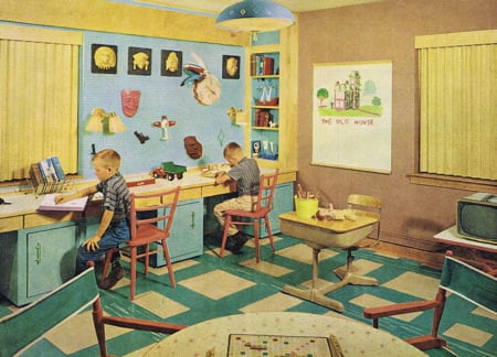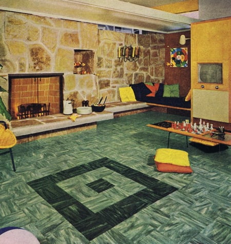 Linoleum wasn’t limited to the kitchen or bath. It was great for playrooms, dens, and even bedrooms, as these pictures from 1960, 1954 and 1952 demonstrate.