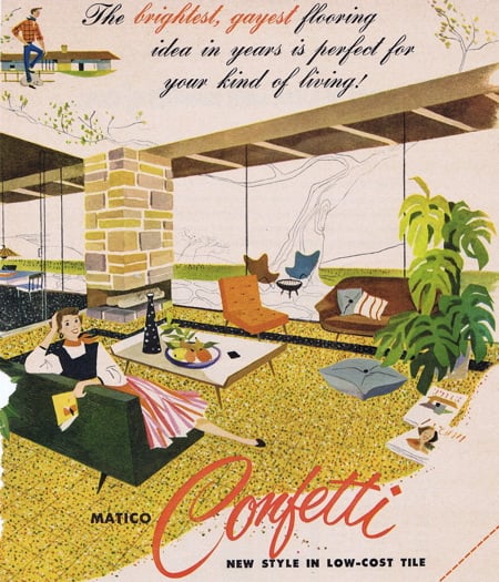 Quite a few firms began manufacturing linoleum and many came up with interesting ways to add colors and patterns. Some of them involved adding color crystals, which were then smashed through rollers, leading to the popular “confetti” look I came to know and love as a kid.