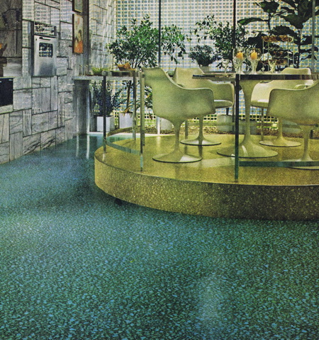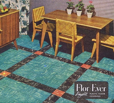 By the early 1960s, floor covering was being made of poly vinyl chloride (PVC), which was shinier and easier to care for. You can certainly see the difference by the time these ads appeared in 1968.