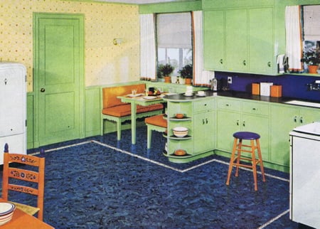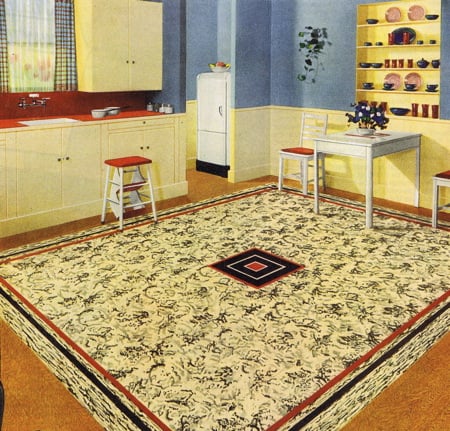 It was Englishman Frederick Walton who first patented the process of using linseed oil combined with various fillers to produce a hard floor covering. The term “linoleum” comes from the Latin linum (“flax”) and oleum (“oil”). Here’s linoleum in action circa 1947 and 1952.