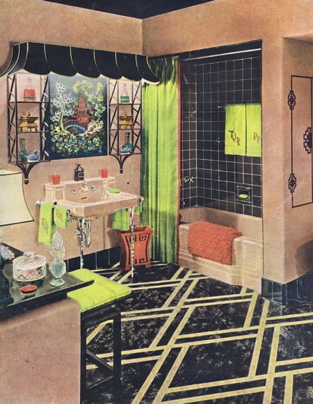 We seem to have gotten away from making a floor the centerpiece of a room, thanks to bolder paint colors and the desire to be able to change a room’s look more easily. But as you can see from many of these ads, the floor made the room back in the heyday of linoleum products. Here are three from 1937, 1934, and 1947.