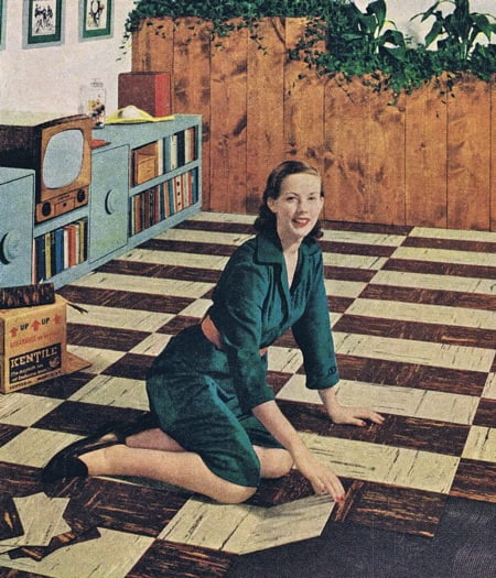 One of the selling features of this miracle floor covering was that you could glue it down yourself, in squares, as shown here in 1952. That was before the self-stick variety.