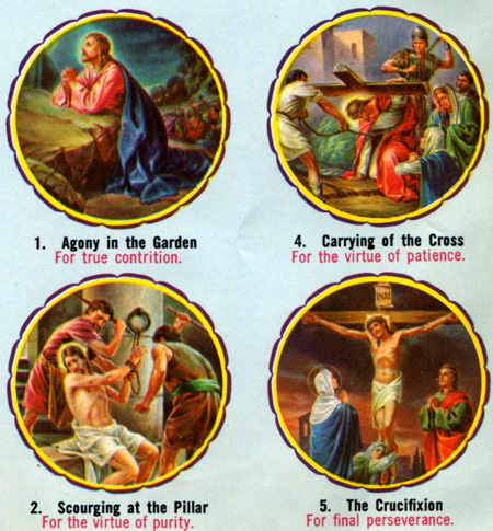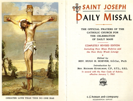 I don’t know if young Catholics still have missals, but in my day it was an important possession and a focal point of Catholic life. The number of holy cards, notations, and other material added to your missal was a pretty good indication of your piety and the seriousness with which you took your young faith. All of the images here are from my sister’s 1963 edition. Click on any image for a larger view.