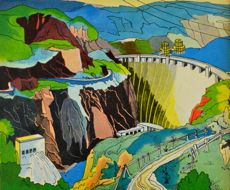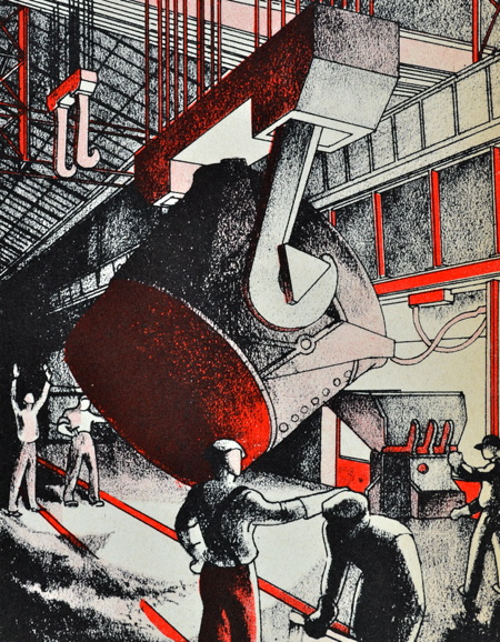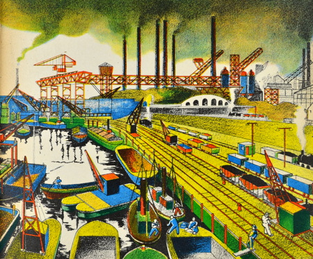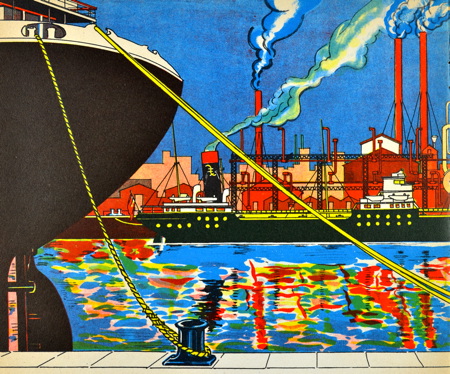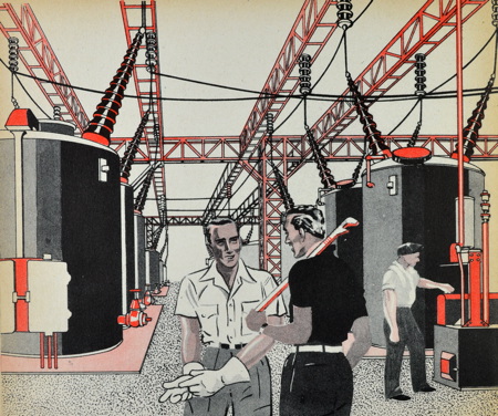 But in 1939 when the illustrations in this installment were published, there was still a lot of fascination with big industry, and we were proud as a nation at the infrastructure we had built for these things. Today’s images come from a series of three books published by the George Duplaix Company in New York: “Oil Comes to Us,” “Electricity Comes to Us,” and “Steel.” The authors are different for the three books, but the illustrator, one Th. D. Luykx, is the same, and each book follows the same format. Click on any image for a larger version.