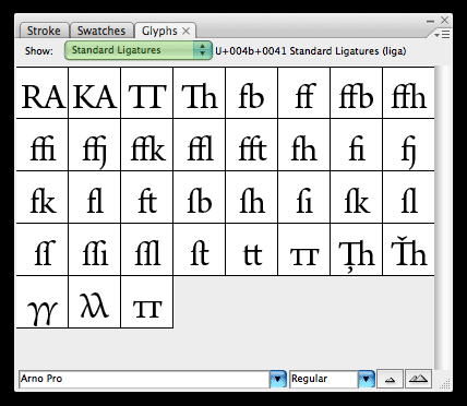 You can view Arno Pro’s standard and discretionary ligatures separately using the pull-down menu of the glyph palette. As you can see in the upper example, there are many more standard ligatures in this typeface than the typical fi and fl, including all-cap and long s (looks like an f with only half a crossbar) ligatures. Below it are Arno Pro’s historic discretionary ligatures.