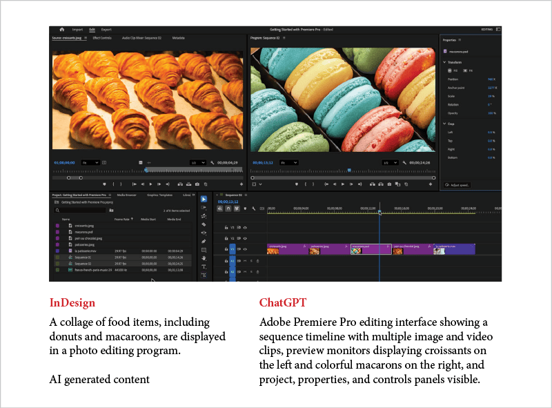 Figure 1. A comparison of alt text generated for the same image by InDesign and ChatGPT. The former can’t tell a donut from a croissant or a macaroon from a macaron—or recognize the interface of another Adobe product.