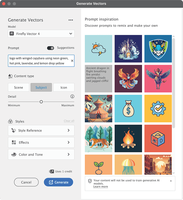 In the Generate Vectors dialog box (Figure 7), choose a model, whether the latest version of Firefly or a partner model (Figure 8). Set the Content Type to Subject for a logo (use Icon or Scene for other types of drawings), and then describe the client’s request in the Prompt field.