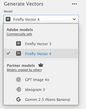 Figure 8. In addition to Adobe’s own Firefly AI, Generate Vectors offers access to image-generating AI models from partners such as ChatGPT and Google.
