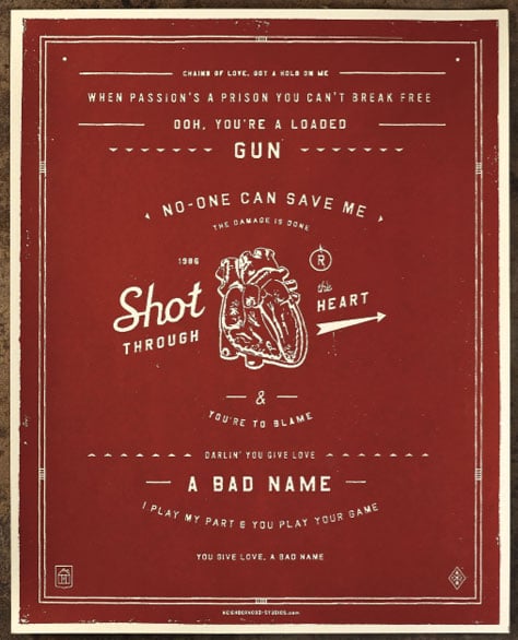 “Shot Through the Heart” is taken from You Give Love a Bad Name by Bon Jovi. It measures 16″ x 20″ and is $50.