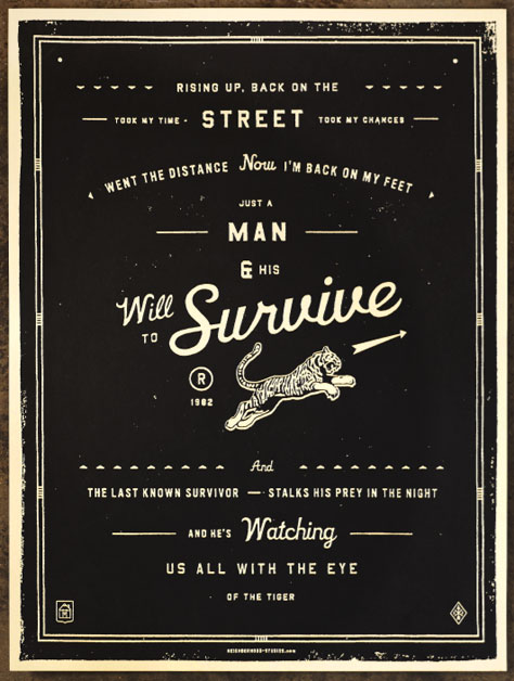 “Will to Survive” (lyrics in the Survivor song Eye Of The Tiger) is 18″ x 24″ and sells for $60.