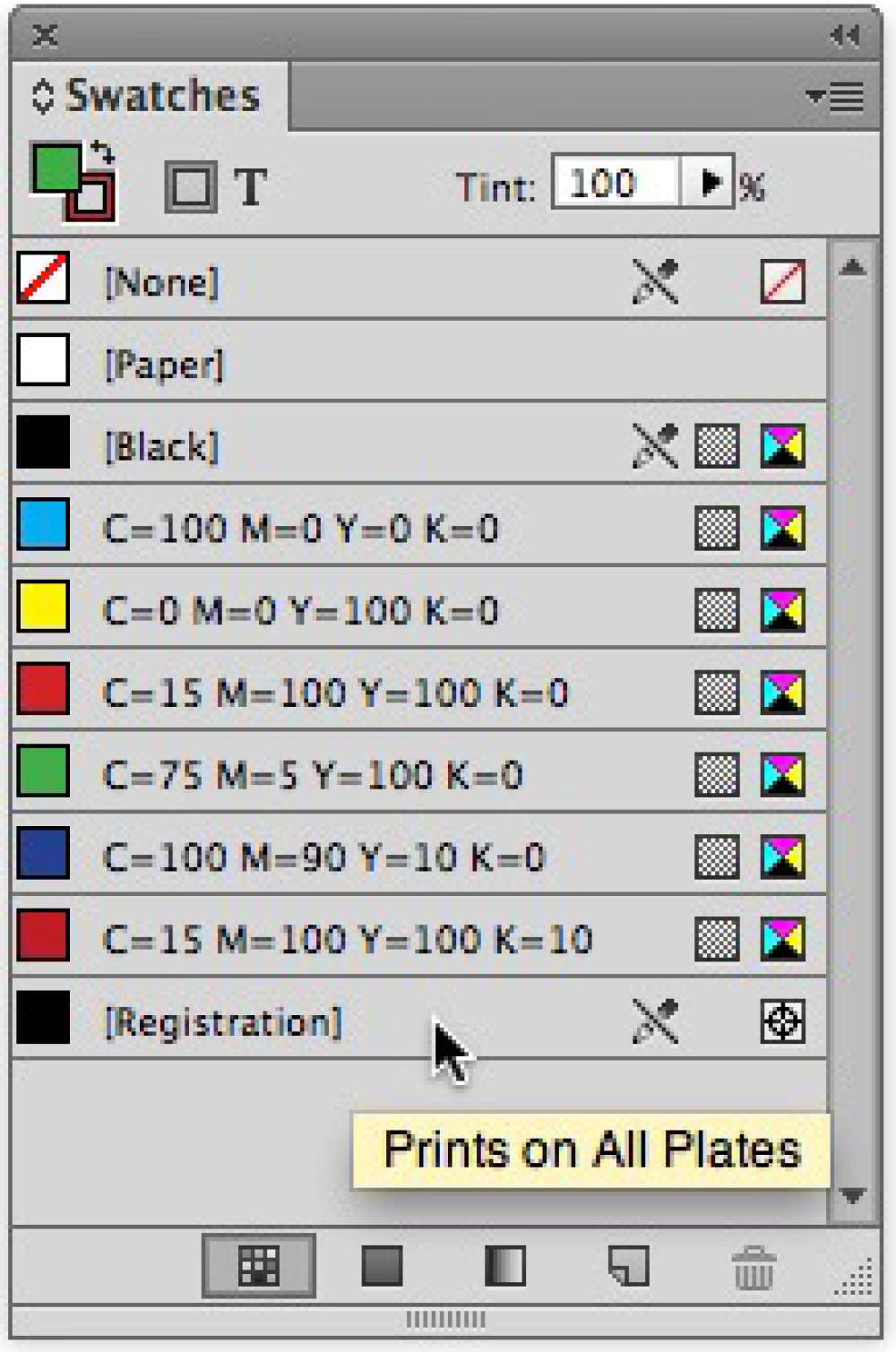 Registration prints on all plates so it is not interchangeable with using Black ink. “There is no place for registration in print production except for registration marks,” says DeJarld. She not only emphasizes that Registration should never be used in place of Black ink, but she also shares a brilliant tip from Anne-Marie Concepción to keep this from happening: Drag Registration to the bottom of the Swatches panel so you can’t click it accidentally (Figure 4).