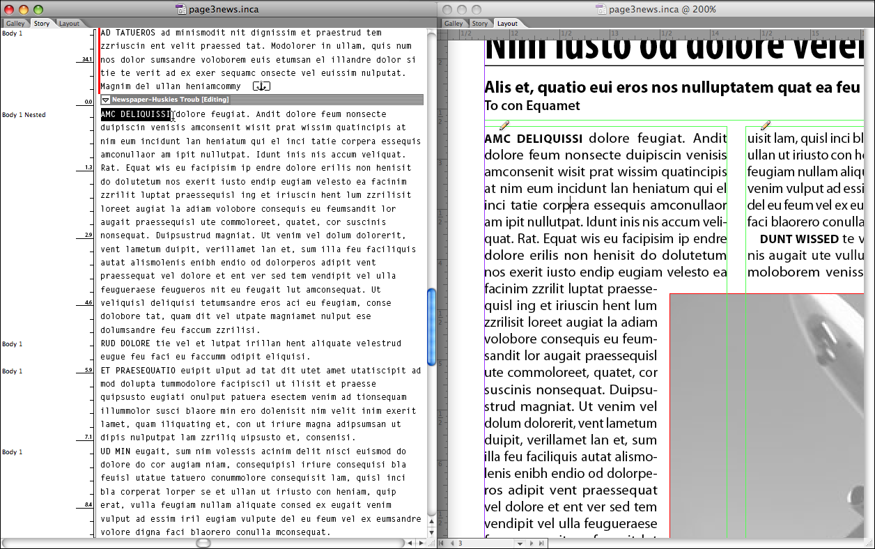 Now, as you edit text in one window (in Story view), your edits are immediately reflected in the other window (in Layout view). You may need to click in the other window occasionally to see a cleaner view of your changes, the screen redraw can get a little wonky.