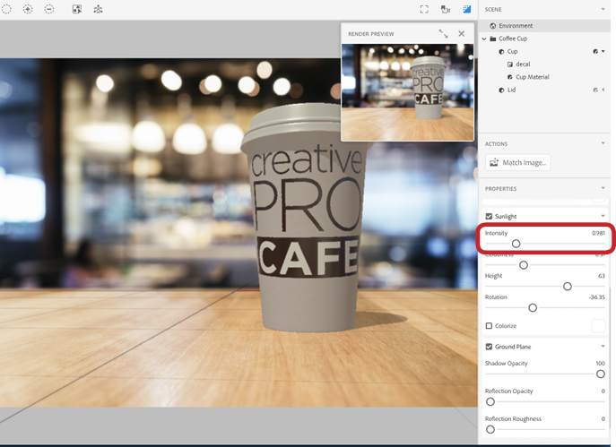 The backlit effect (complete with shadows on the ground plane) is technically correct, since the only lights that are apparent are behind the coffee cup. But it’s just too dim overall. To fix this, we can go to the Scene panel and target the Environment. Then go to the Properties panel, and make some changes to the lighting. In this case, I would start by changing the Rotation value of sunlight to simulate light coming through a window in front of the coffee cup. At an angle of 0°, the sunlight is coming straight at the cup. I might move it a bit to, say, –40°, to keep a shadow visible on the counter, and then increase the Intensity value until the overall brightness of the cup matches that of the countertop (Figure 22).