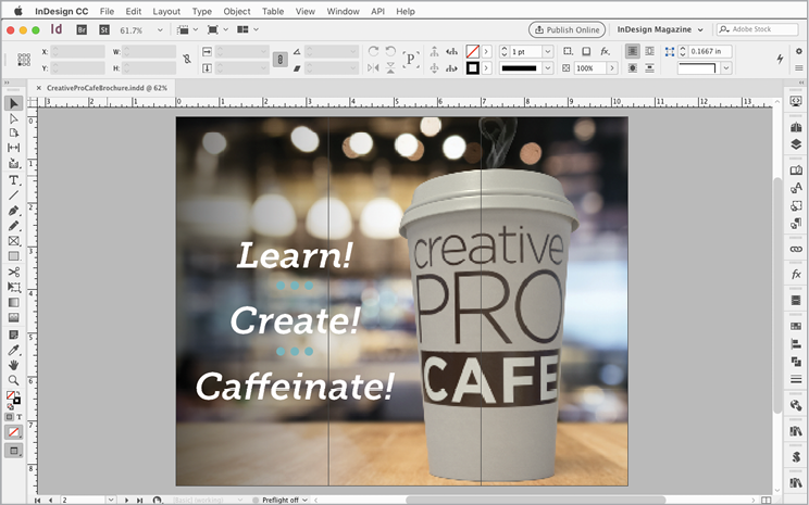 The best way to learn a program like Dimension CC is to just jump right in and start making something. Let’s say I had an idea to start a new chain of coffee shops for creatives. Yes, I know Starbucks already exists, but my coffee shops will be cooler because they’ll be called CreativePro Cafes! Plus they’ll offer drinks with names like “Liquid Layout,” and the tip jar on the counter will be full of InDesign tips printed on little cards.