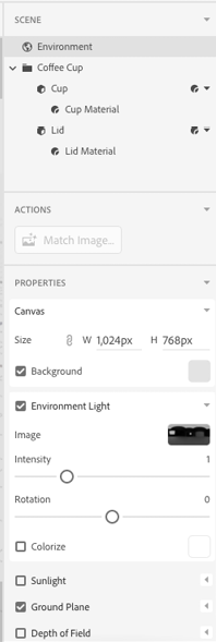 At the top of the Scene panel is Environment. Click this when you want to make changes to the entire scene, by changing the canvas size (1024 × 768 by default), customizing lighting properties, shadows, reflections, and so on. Click an item to adjust that item’s properties.
