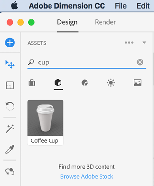 For our CreativePro Cafe brochure, we want an image of a coffee cup sitting on the counter. So, to find a cup, go to the Assets panel, and click the Models button. Then either browse the models built into Dimension CC, or use the search function. Typing cup filters the available models to show just the coffee cup (Figure 8).