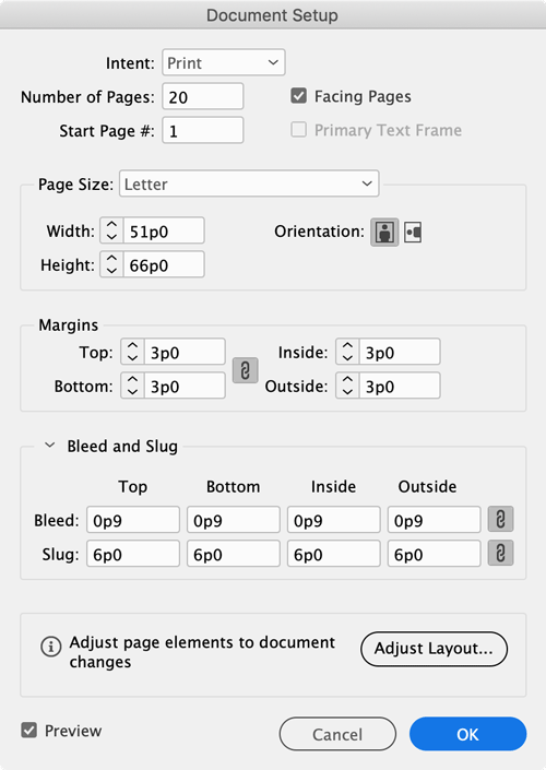 Because Document Setup doesn’t affect page objects, I rarely use it, except to correct something I overlooked when creating the documents (such as using non-facing pages or setting an incorrect bleed amount).