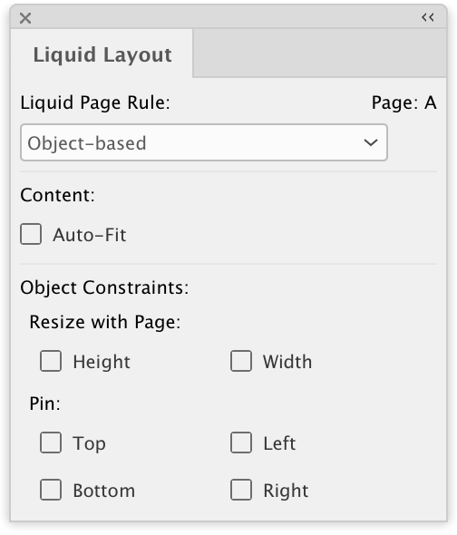 - Object-based: This is the most powerful liquid rule: it lets you specify settings for each object on your page. To use this method, use the Page tool to select an object on the page, and then set these options in the Liquid Layout panel: