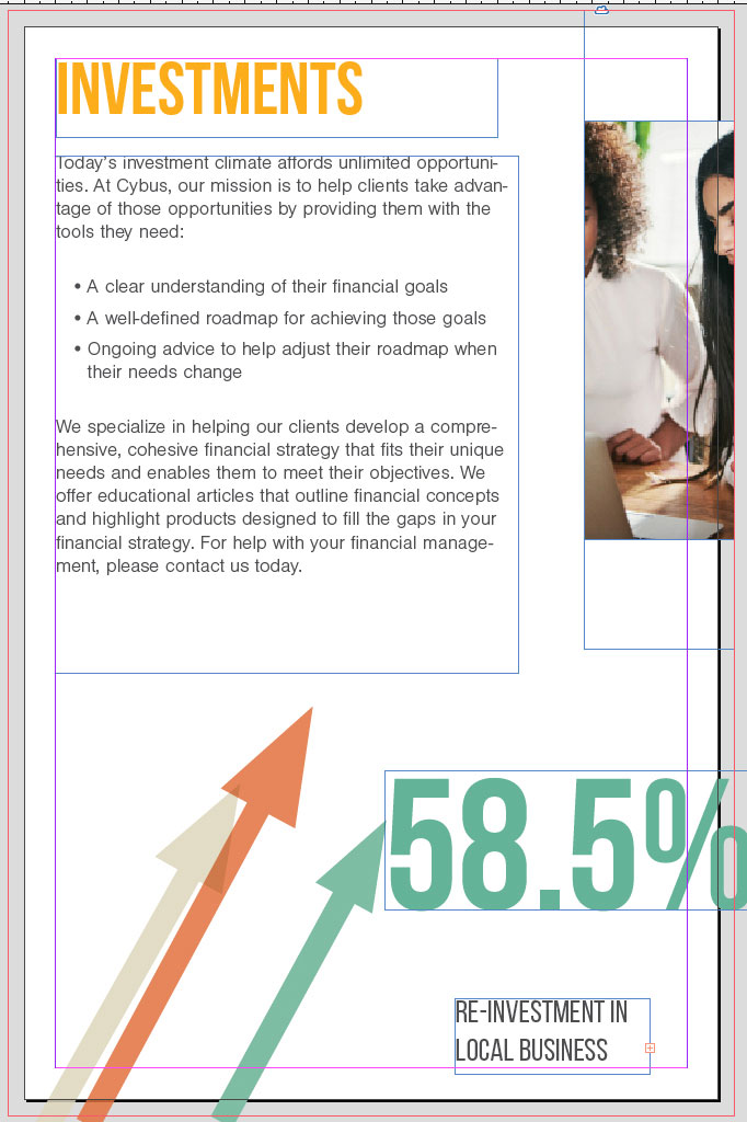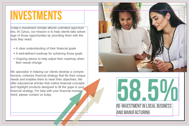 Whichever route you take to get to Adjust Layout, you’ll see the page objects scale and move to fit any new page parameters you’ve entered. Of course, nothing is perfect: vector shapes created in InDesign may change in unexpected ways, so that’s something to keep an eye on. Similarly, anchored objects can occasionally act in crazy ways after resizing.