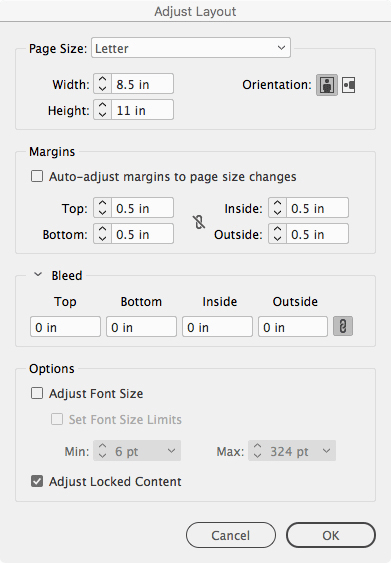 Keep in mind that Adjust Layout will affect only pages that don’t have local page-size overrides. That is, individual pages that you’ve resized using the Page tool or via the Pages panel won’t get changed, and there is also no adjustment to the objects on those pages. So if you’re working in a document with several mixed page sizes, you probably won’t get much use out of Adjust Layout.