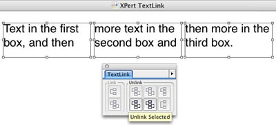 You can’t do that in QuarkXPress. But with TextLink, you just select all the text boxes and click the bottom center button. All the boxes are now unlinked and they retain their text (Figure 6).