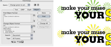 You can find and change text, sure. But in CS3, you can also find and change text insets, text wrap, text and object colors (stroke and fill), transparency, baseline grid, straight quotes, smart quotes — just about anything (Figure 6).